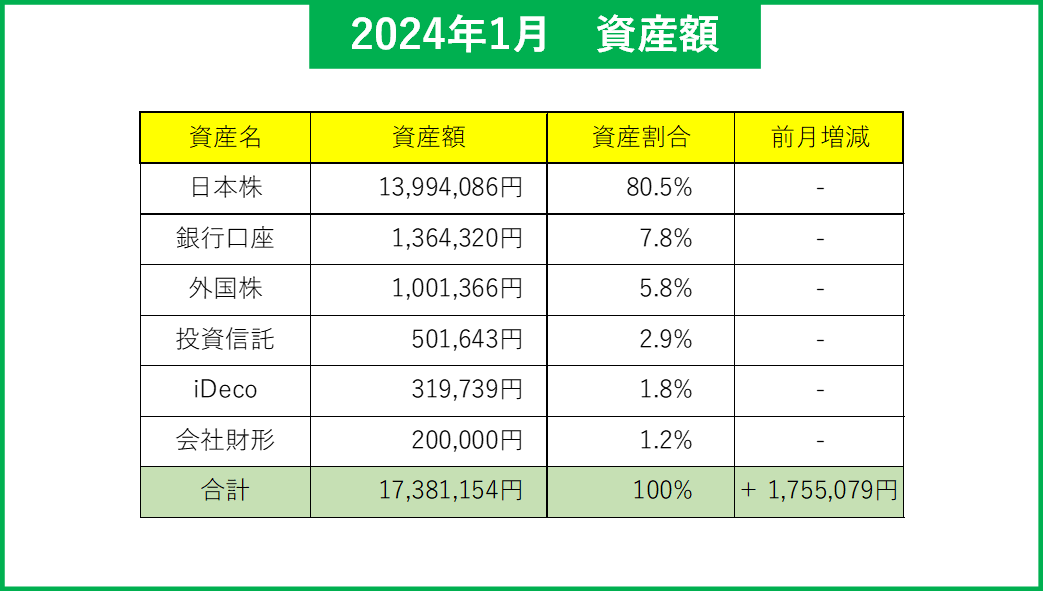 12月と比べたら +1,755,079円の増加で、トータル資産が 17,381,154円になりました!!