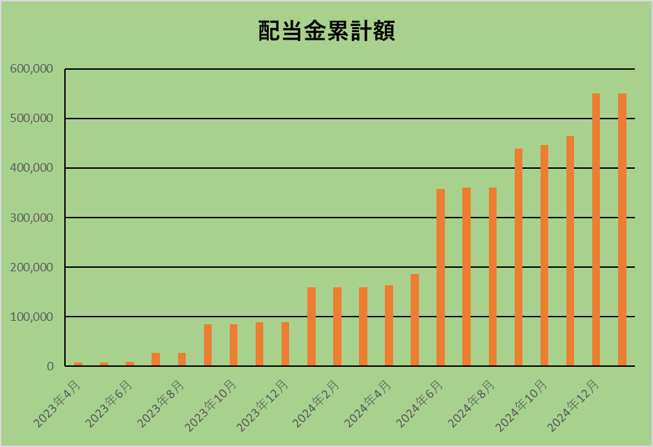2025年1月時点で累計額は 550,732円ですが、1月の配当額は0です。次回は3月に配当金が入る予定なので、