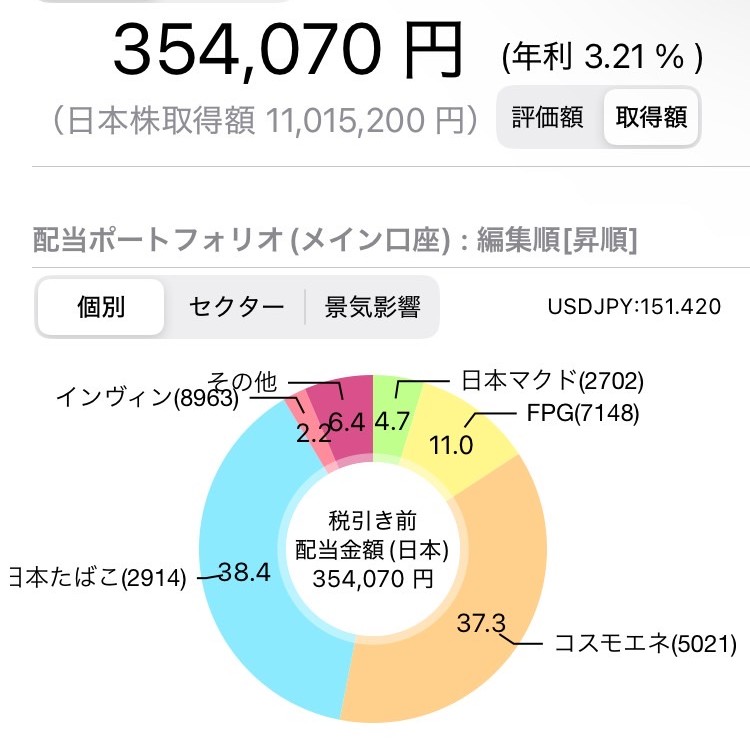今年に入って株の整理を行い、一部売却しました。その結果、配当株が年間10万円減りました。